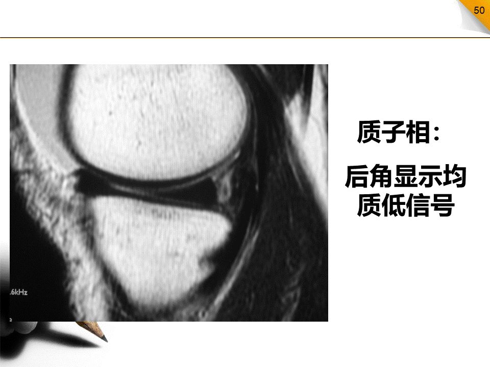 MRI扫描序列的比较T1WI:显示半月板撕裂敏感性高,但特异性差T2WI:显示半月板撕裂敏感性较差质子加权相:诊断半月板病变敏感性与特异性均较高