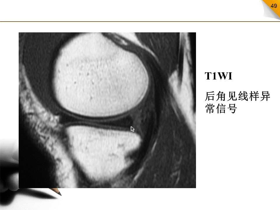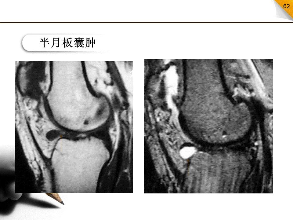 包括撕裂、变性、盘状和囊肿 MRI是显示半月板结构最为理想的检查方法T2WI像的半月板和关节液信号对比强烈,利于观察半月板表面质子密度像对板内信号变化十分敏感联合冠状面和矢状面成像基本可满足诊断