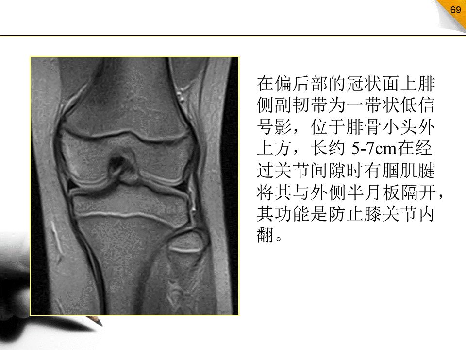 - 多用于显示内外侧附韧带、腘肌和拱状韧带有无信号和结构改变