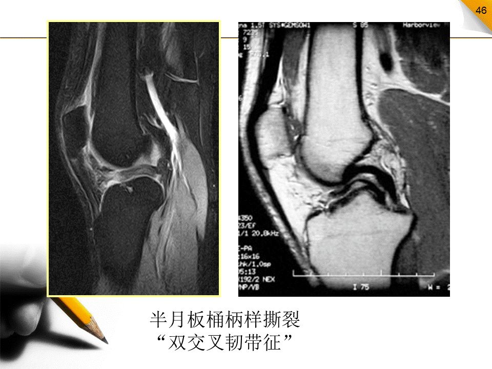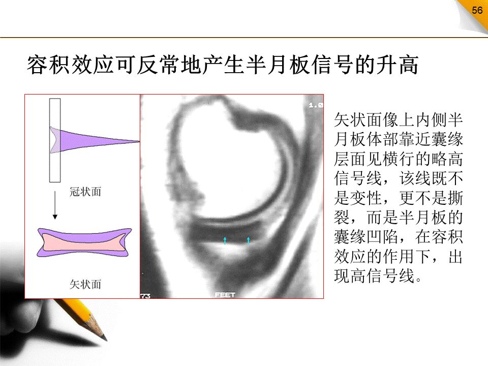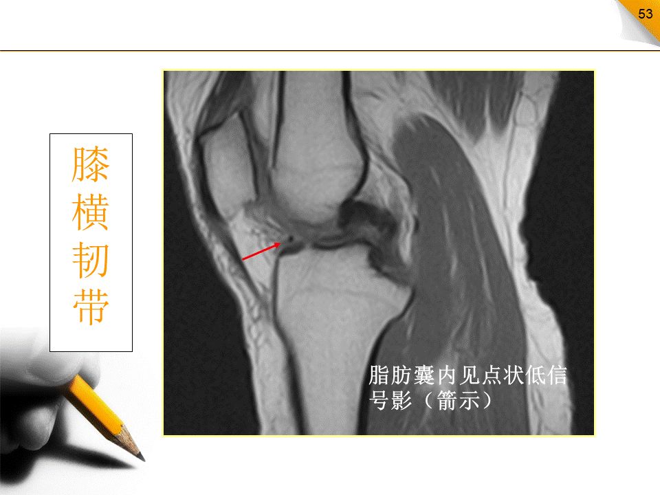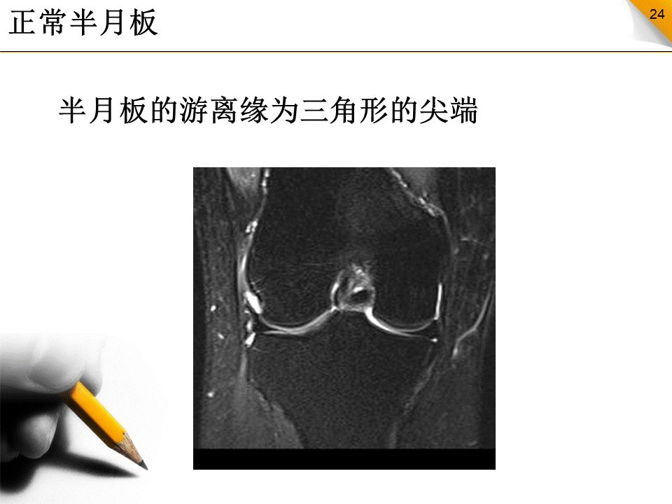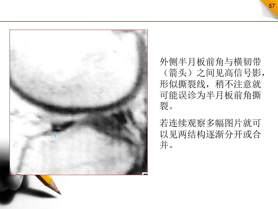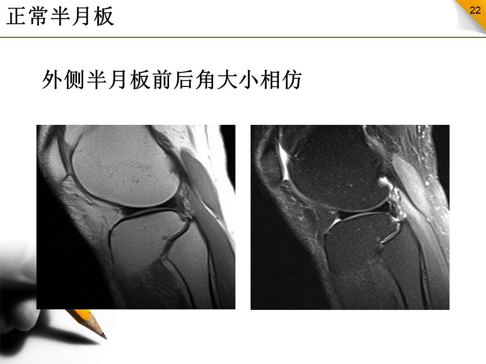 MRI假阳性:小于5%的半月板内撕裂,在关节镜的常规检查中易被漏诊,需用探子探查时才能发现MRI假阴性:部分病例是在关节镜中将半月板的毛刷状改变或纤维化解释为半月板撕裂横韧带:连续层面观察,圆形低信号影自外侧半月板前角一直延伸至内侧半月板的前角板股韧带:连续矢状面观察,假撕裂线逐渐增宽,直至消失半月板松弛:半月板皱褶或波浪样改变,但半月板内无异常信号瘢痕:外侧半月板的游离缘多见,多有手术史或严重的膝关节炎史。半月板本身无异常。