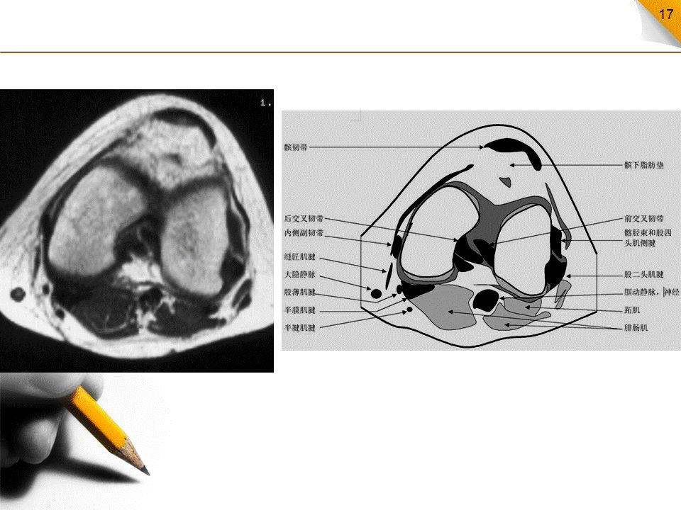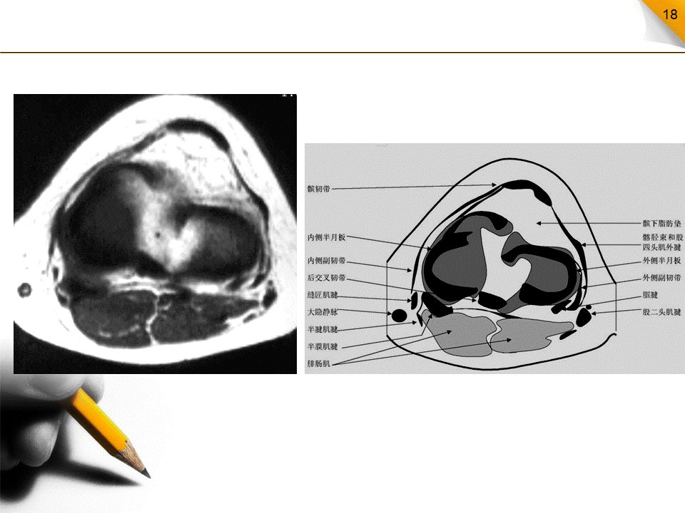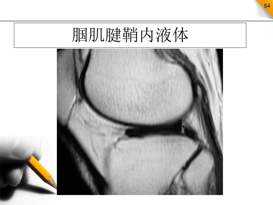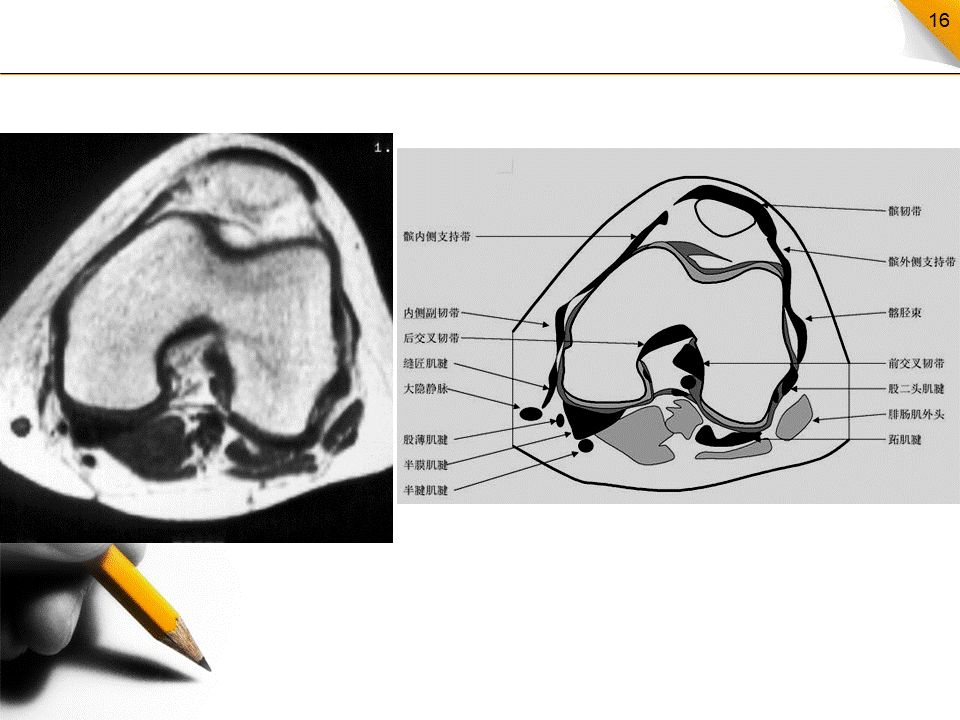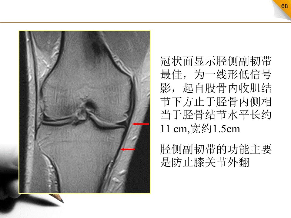 - 显示关节边缘层次的结构不理想,如髌支持带和内外侧副韧带等,因容积效应作用而显示不清