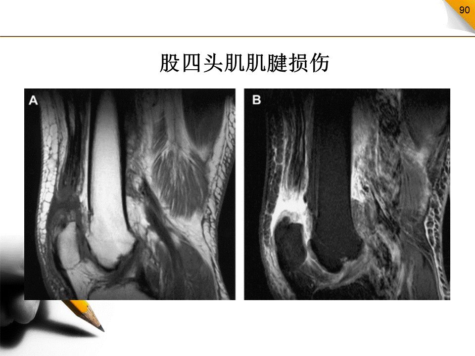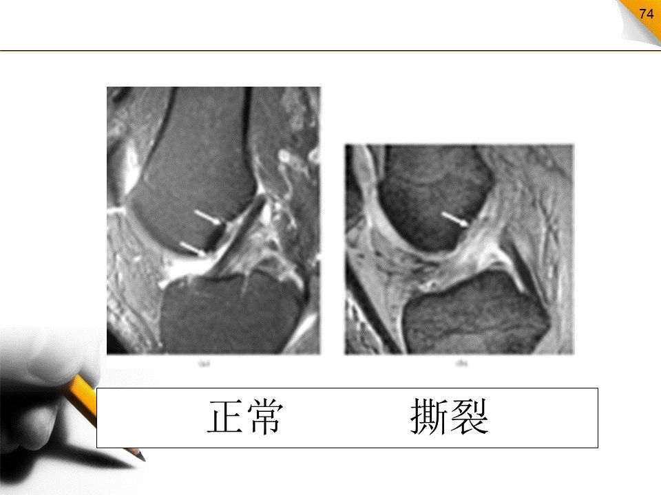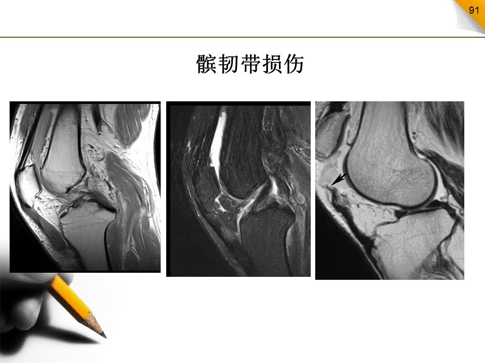 部分撕裂:局部信号增高、边缘毛糙松弛扭曲完全撕裂:连续性中断,断端毛糙呈拖把状急性撕裂:伴有关节腔积液和髌下脂肪垫水肿