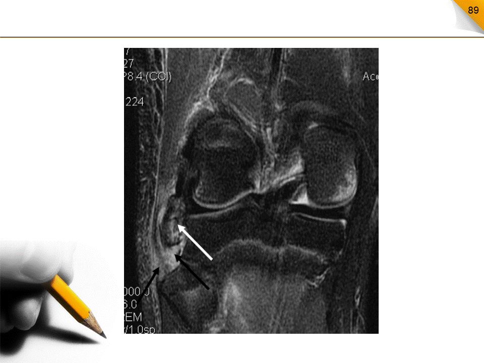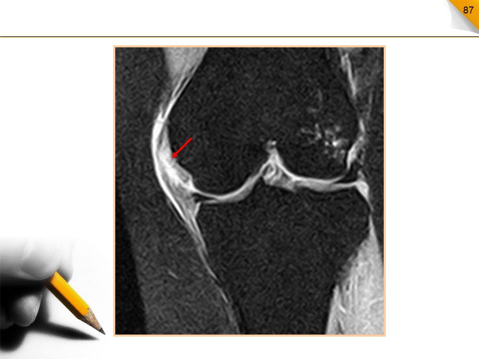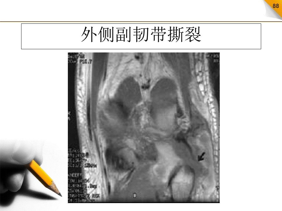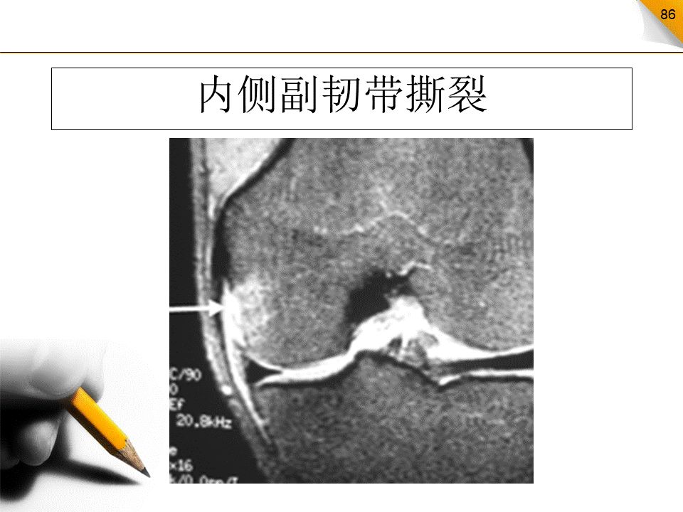 膝关节屈曲状态下,外展力的作用通常位于股骨髁的附着处,其次位于中段,发生在胫骨附着处则很少见可伴囊韧带、内侧半月板和ACL联合撕裂MRI:冠状面显像佳,韧带信号和形态改变
