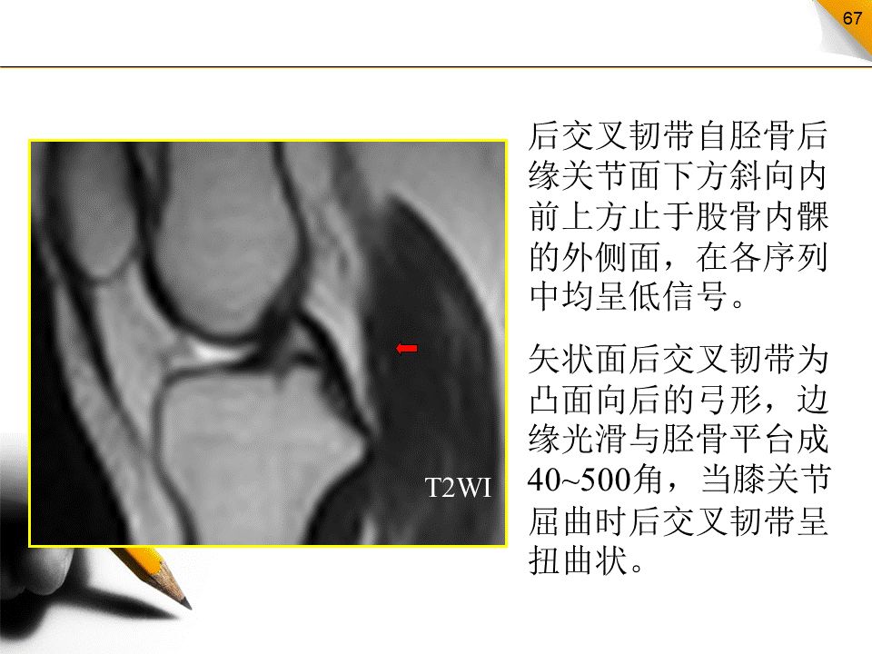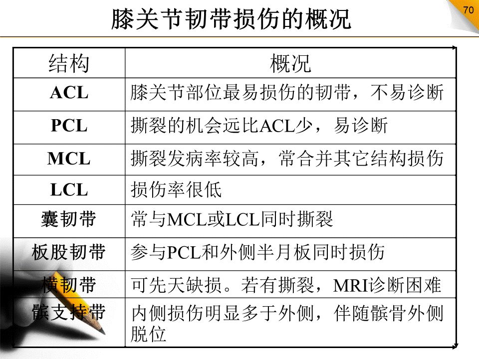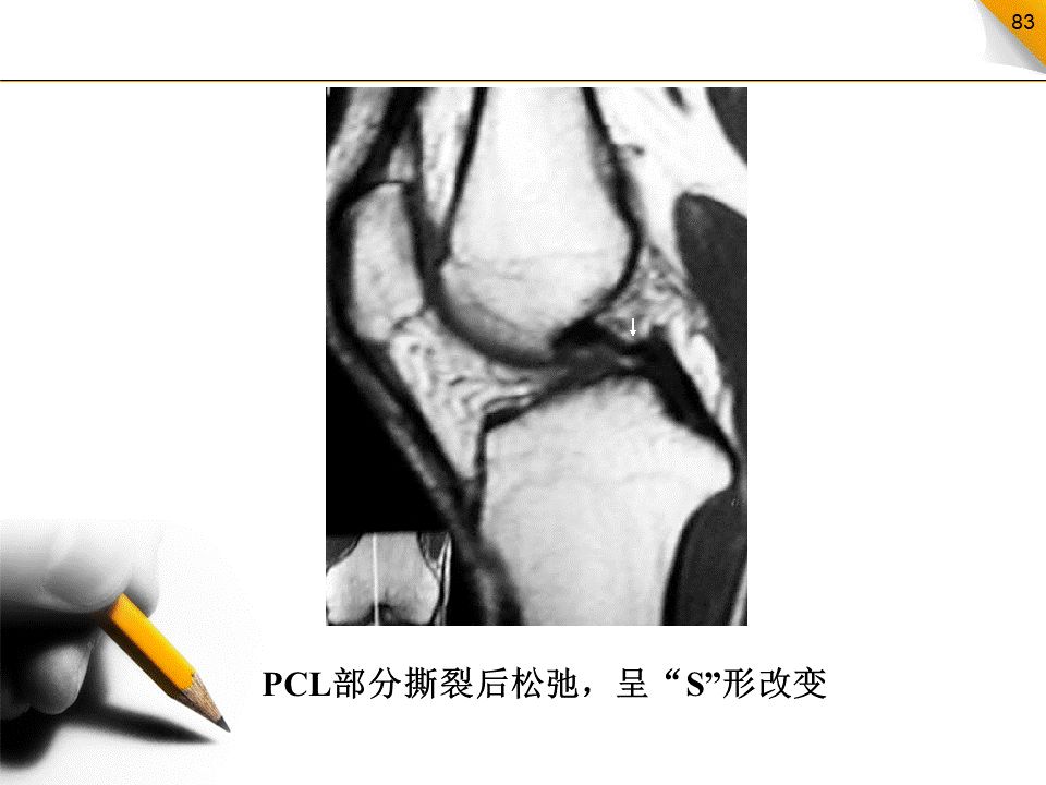 后交叉韧带撕裂约占所有膝关节韧带损伤的5%至20%直接向后作用于膝关节的损伤时最常发生易伴发多韧带损伤,继发膝关节不稳定MRI显示韧带信号和形态改变最敏感