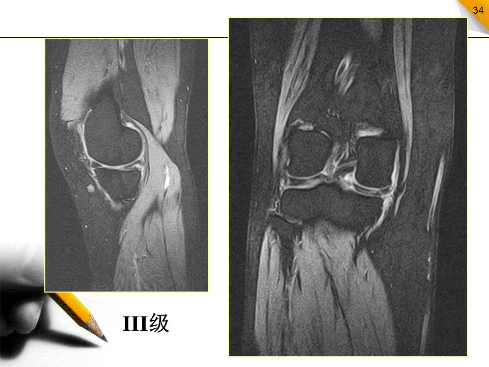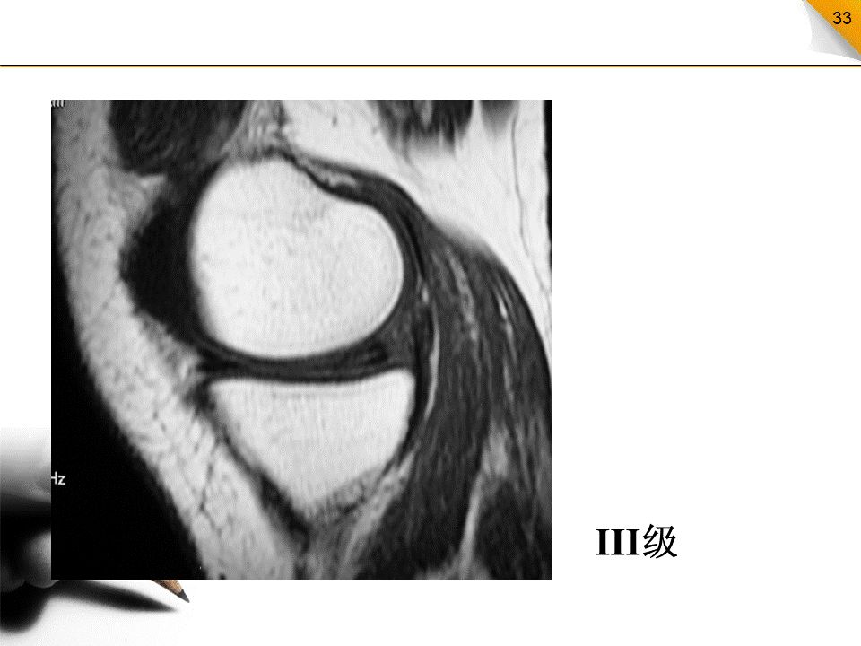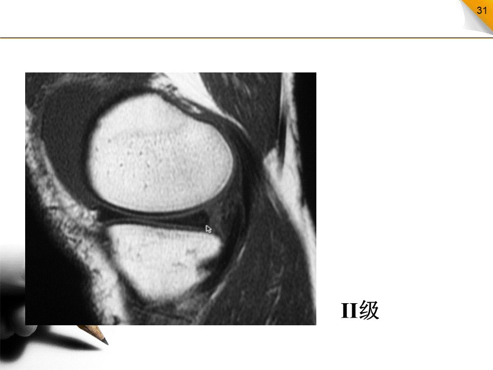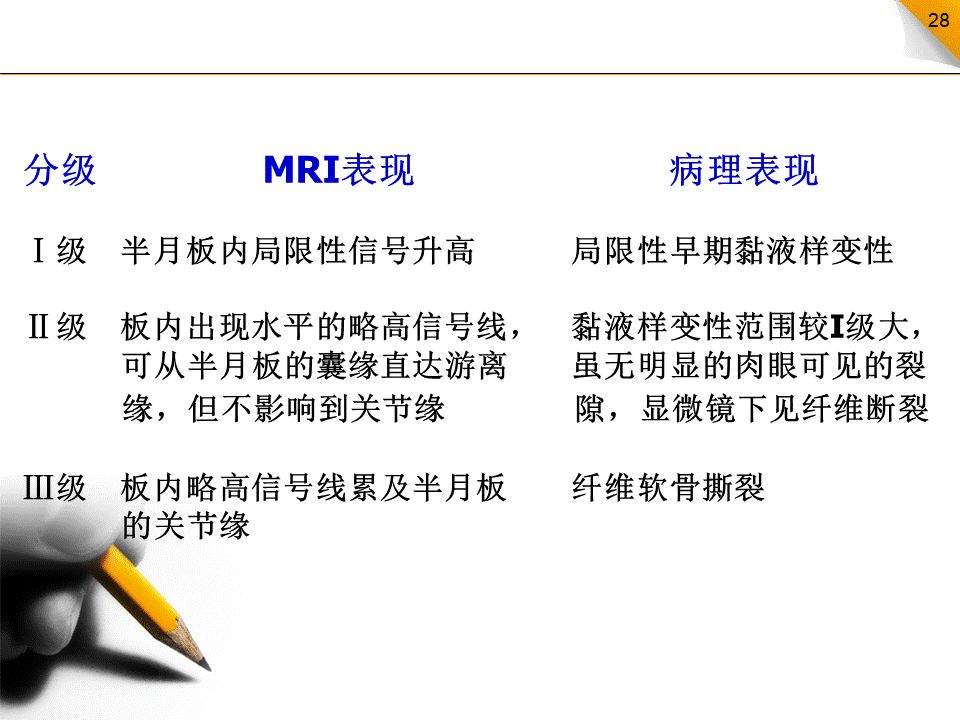 - MRI分级:根据信号的形态及其与半月板关节面间的相对关系来确定。