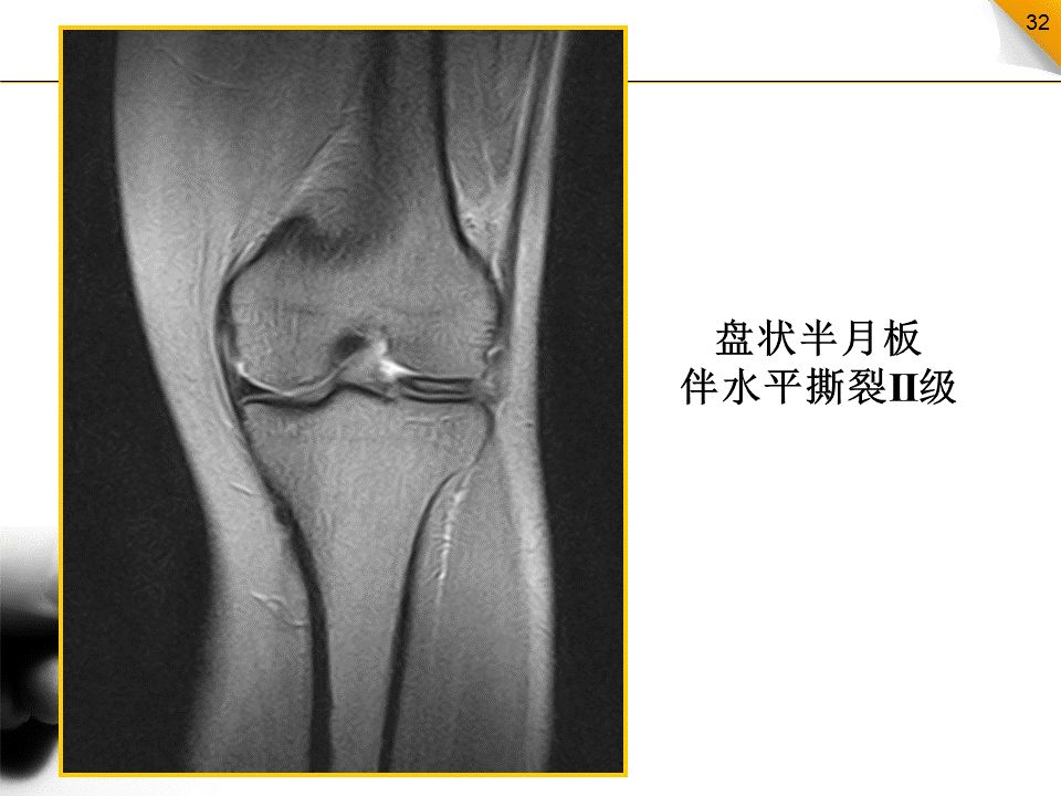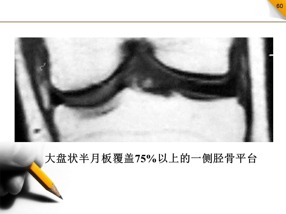 属发育变异;外侧(占95%)远比内侧多见临床表现为膝部疼痛、弹响和绞锁盘状半月板易发生半月板撕裂和囊肿并可引起软骨磨损或剥脱性骨软骨炎矢状面:连续三个层面均呈双凹镜样表现冠状面:盘状半月板中部宽度显著增宽,与同侧胫骨关节面宽度的比率(板/胫比率)超过50%。板/胫比率:51%-75%--小盘状半月板;大于75%--大盘状半月板