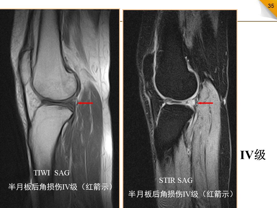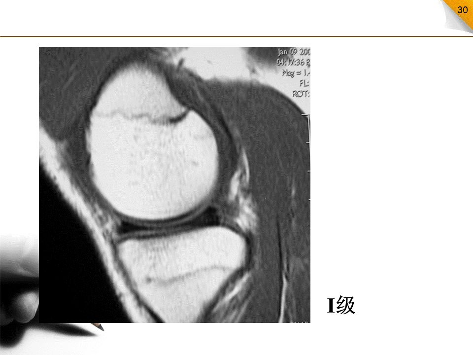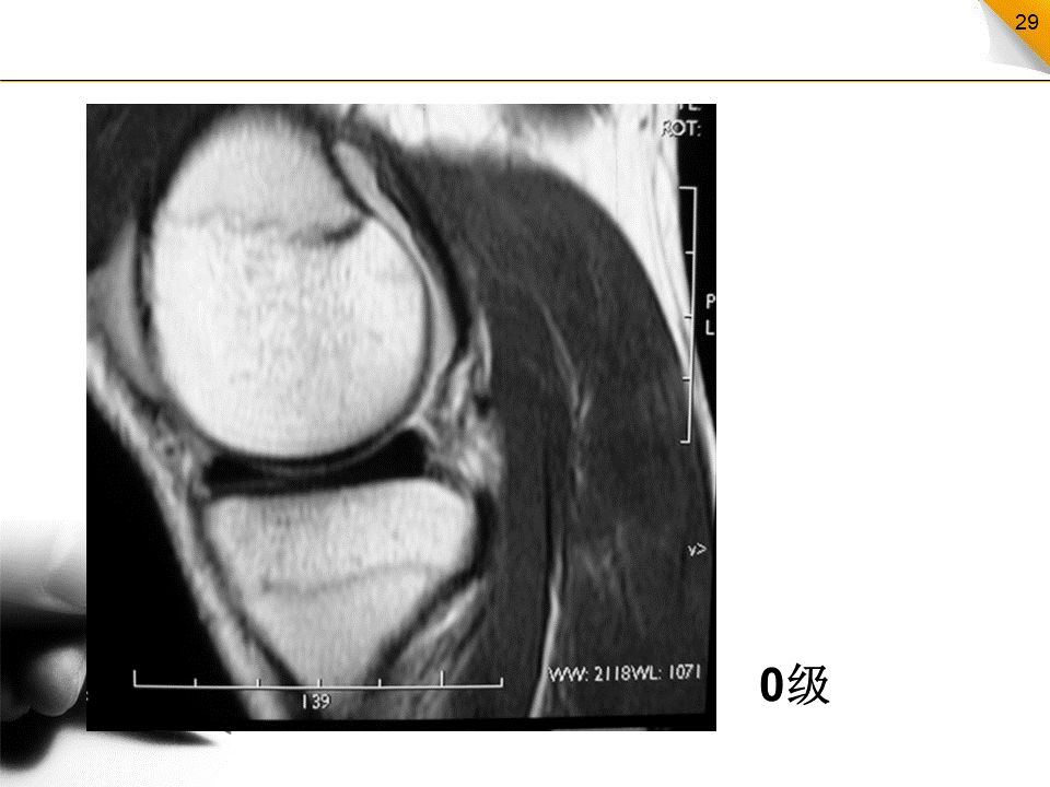 0级:正常半月板,均匀的低信号,形态规则I级:不与半月板关节面相接触的灶性信号增高影II级:半月板内线性信号增高,可延伸至半月板的关节囊缘,但未达到半月板的关节面缘,是I级信号改变的继续,范围更广III级:半月板内的高信号达到半月板的关节面,代表半月板的撕裂IV级:半月板破碎成多块并向关节腔内移位