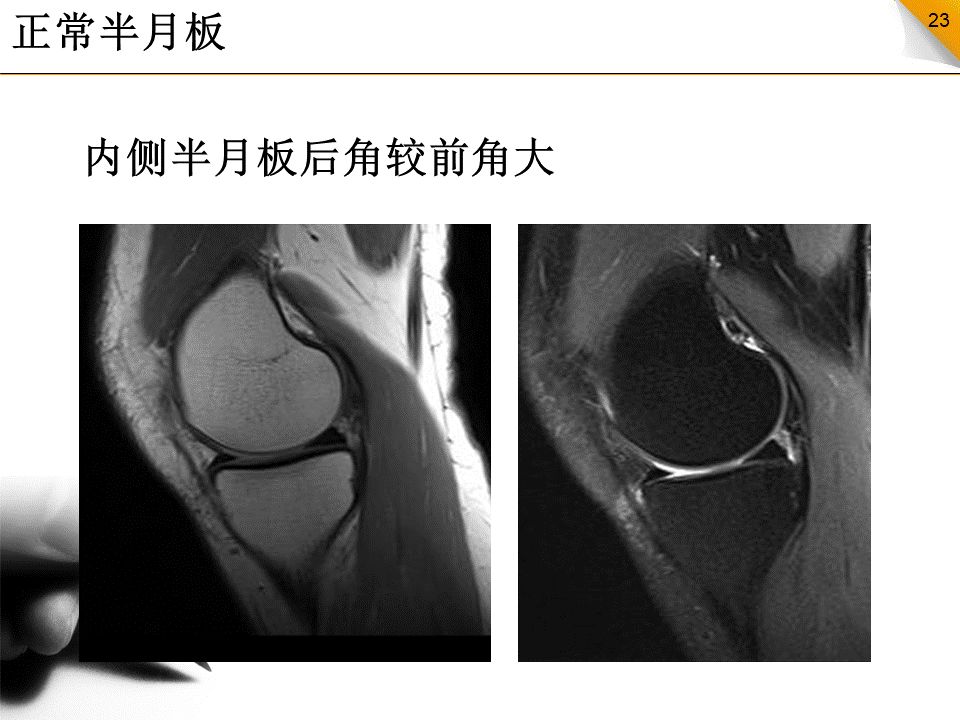 正常半月板在各个序列中均呈低信号矢状面:半月板前、后角分开2个尖端相对的三角形冠状面:一尖端指向髁间窝的三角形低信号影,宽度一般不超过15mm横断面:5mm层厚对于半月板病变显示的作用不大