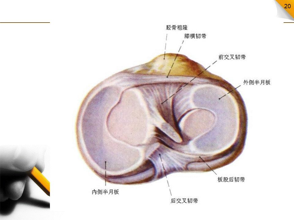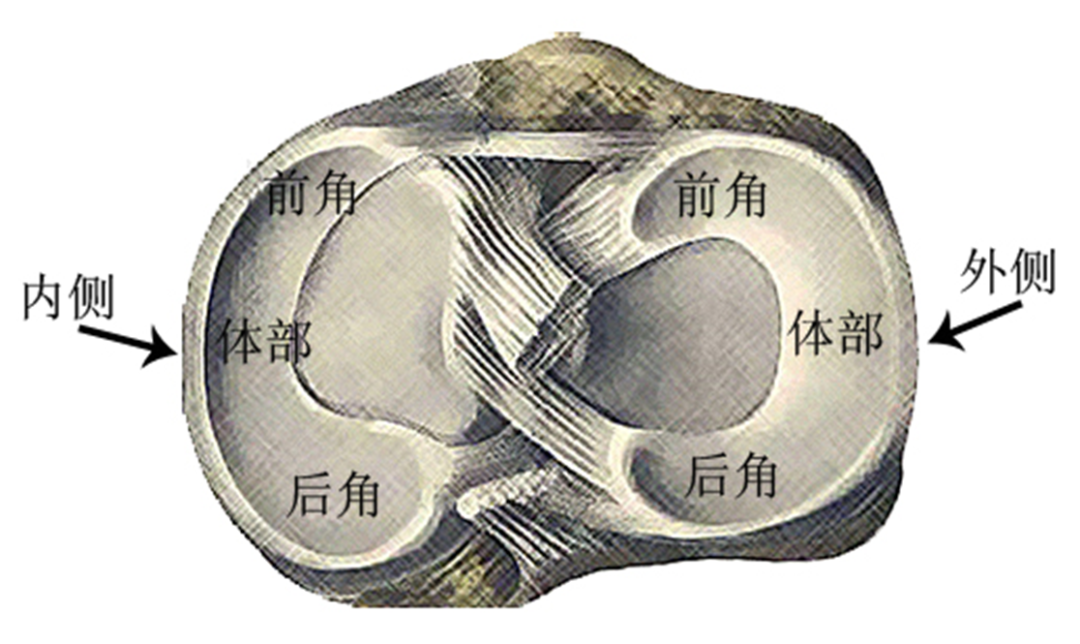 由胫骨和股骨之间纤维软骨构成分为前角、体部、后角三个部分半月板内纤维呈有规律的环形和横向排列环形纤维:占大部分,维持着半月板的形状横向纤维:连接半月板的外缘和内缘,形成半月板的抗张强度(韧性)