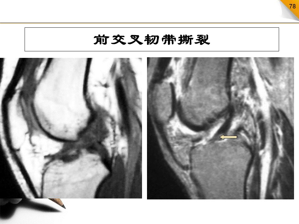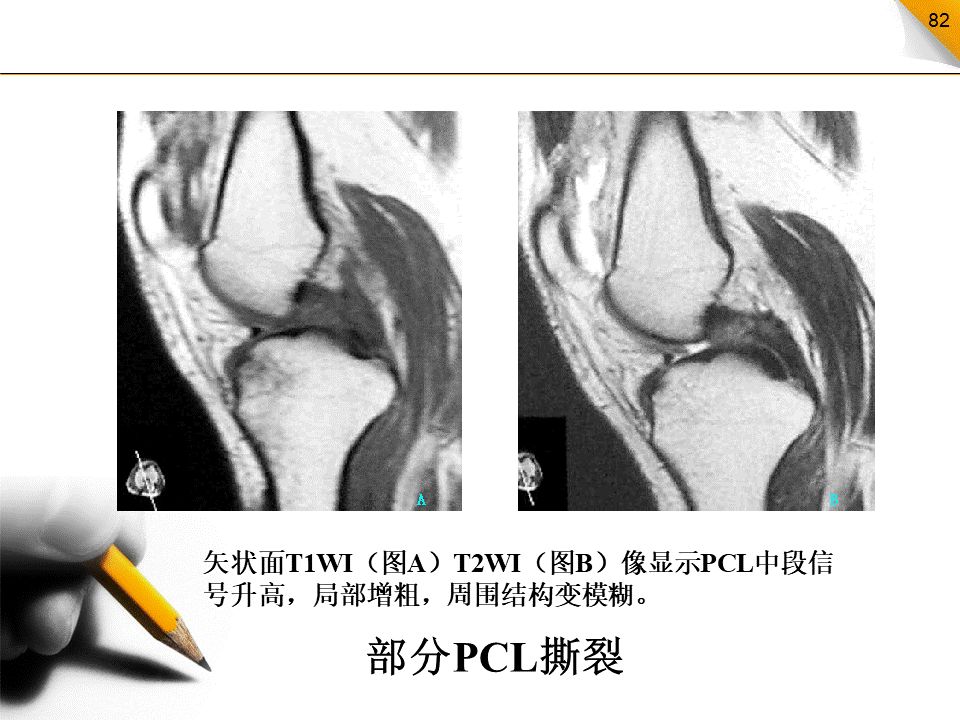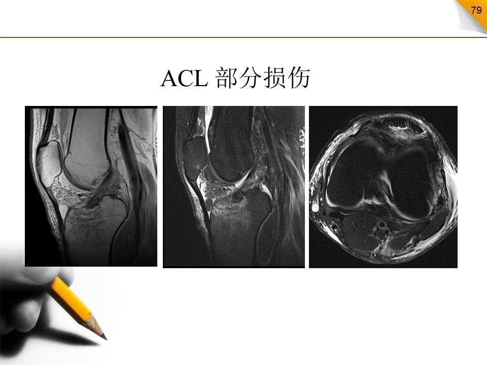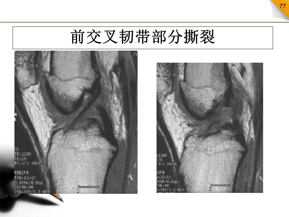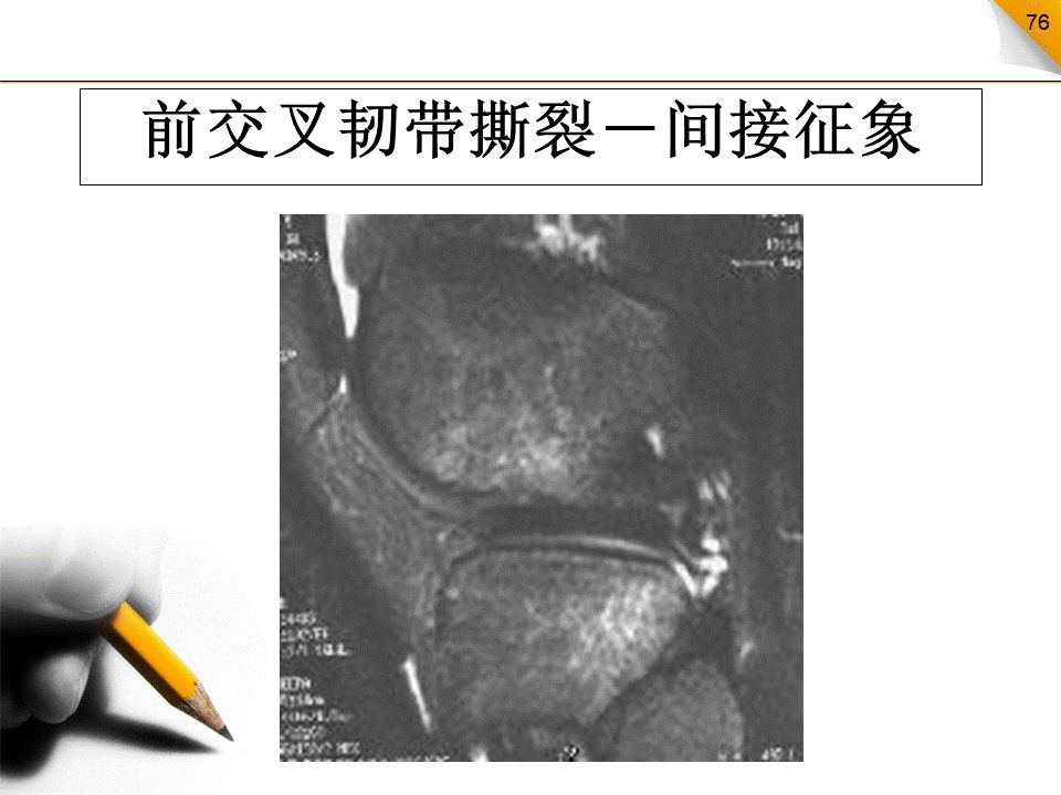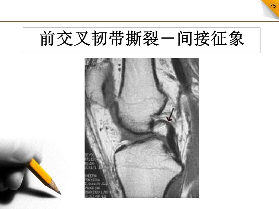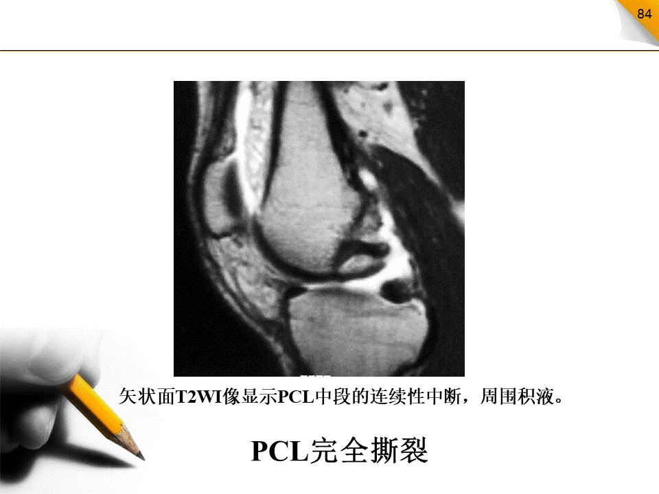 前交叉韧带完全撕裂直接征象:连续性中断、韧带增粗、信号增高间接征象:PCL曲度异常、胫骨前移、股骨髁和胫骨平台的骨挫伤、半月板及侧副韧带撕裂等。