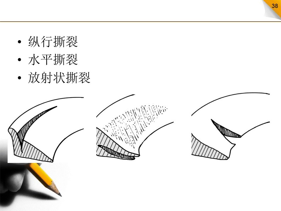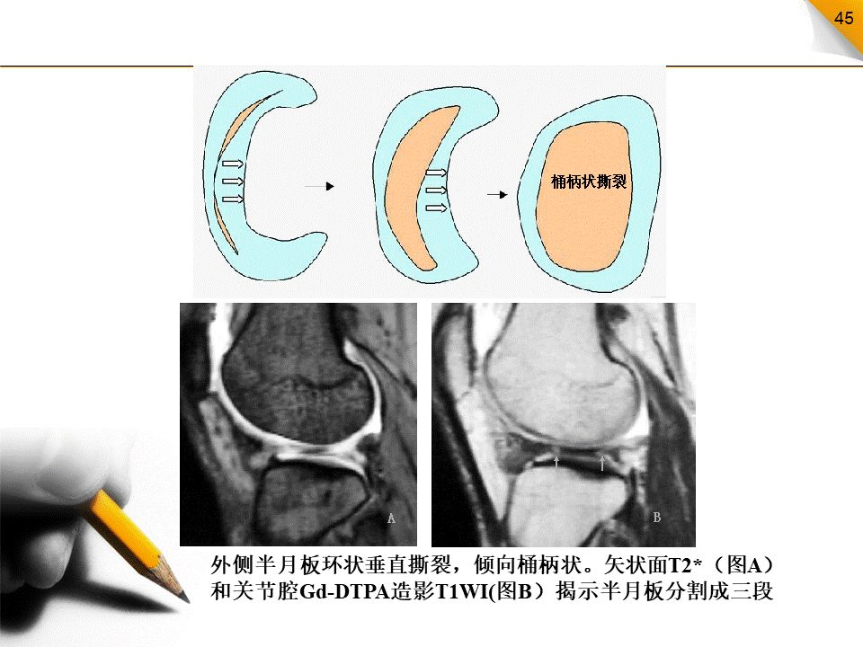 - 纵向的垂直撕裂易演化成桶柄状撕裂
