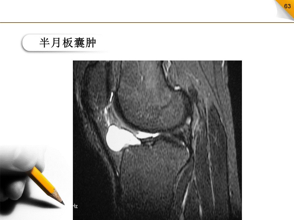 半月板内或囊缘囊性病变多伴有半月板水平撕裂与半月板之间偶可见线样连接,囊肿尖端指向半月板邻近的半月板多呈水平撕裂,呈T1WI低信号、T2WI高信号