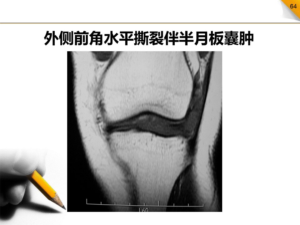 - 水平撕裂容易在半月板的囊缘形成半月板囊肿