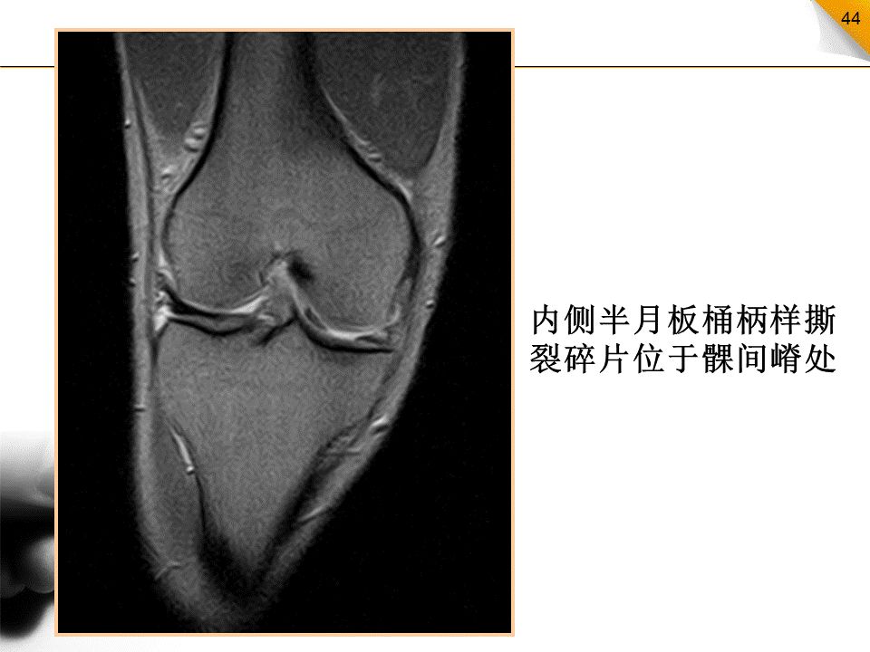 半月板的宽度减小,同时可见半月板内移矢状面显示残余的前角或后角变小或截断,信号有或无增高矢状面上出现“双前交叉韧带征”或“双后交叉韧带征”。冠状面在髁间窝内有低信号的半月板组织位于交叉韧带旁。