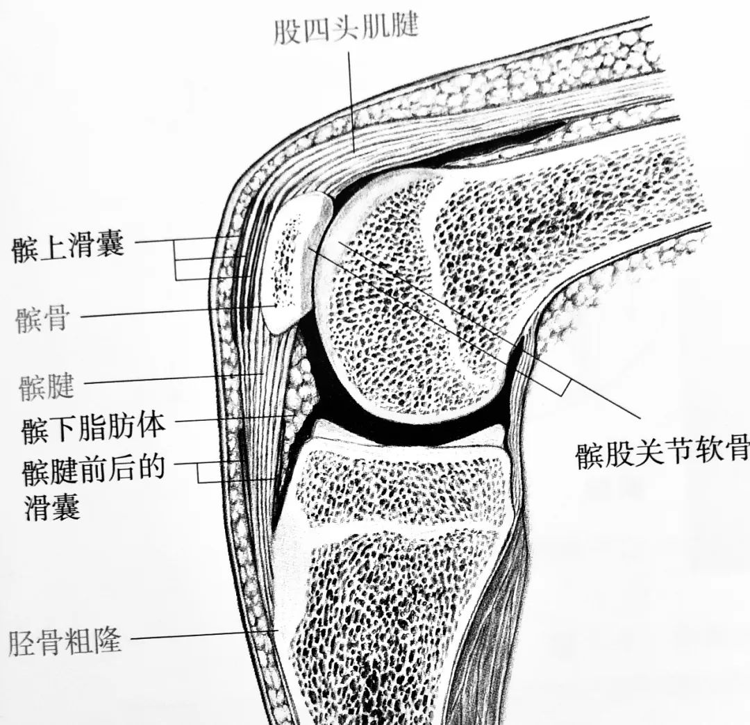 从纵切面看,伸展结构包括:髌上滑囊、髌股关节软骨,加上髌下脂肪体(IPF),再由髌骨上部与髌腱前后的多个滑液囊,组成了滑动的结构。