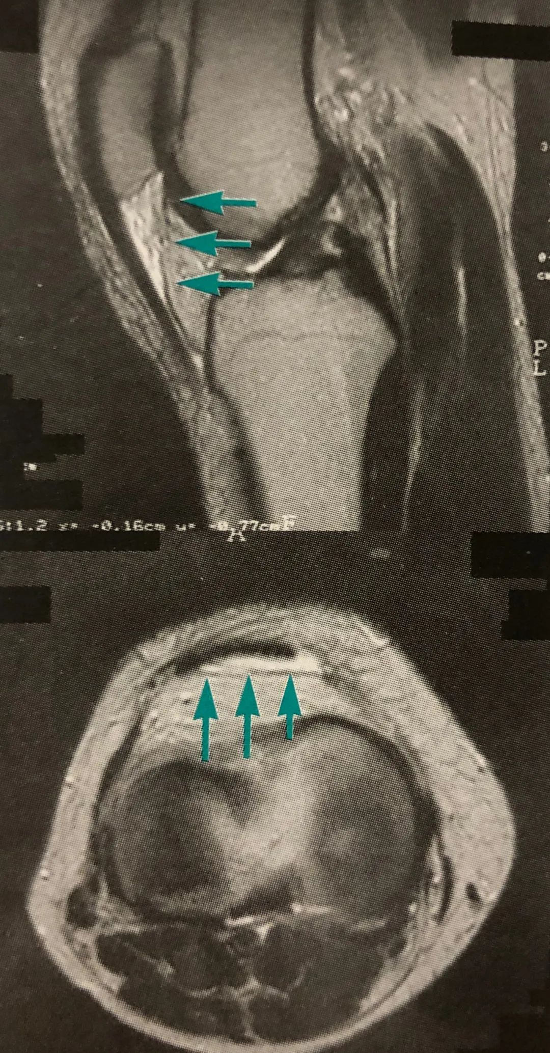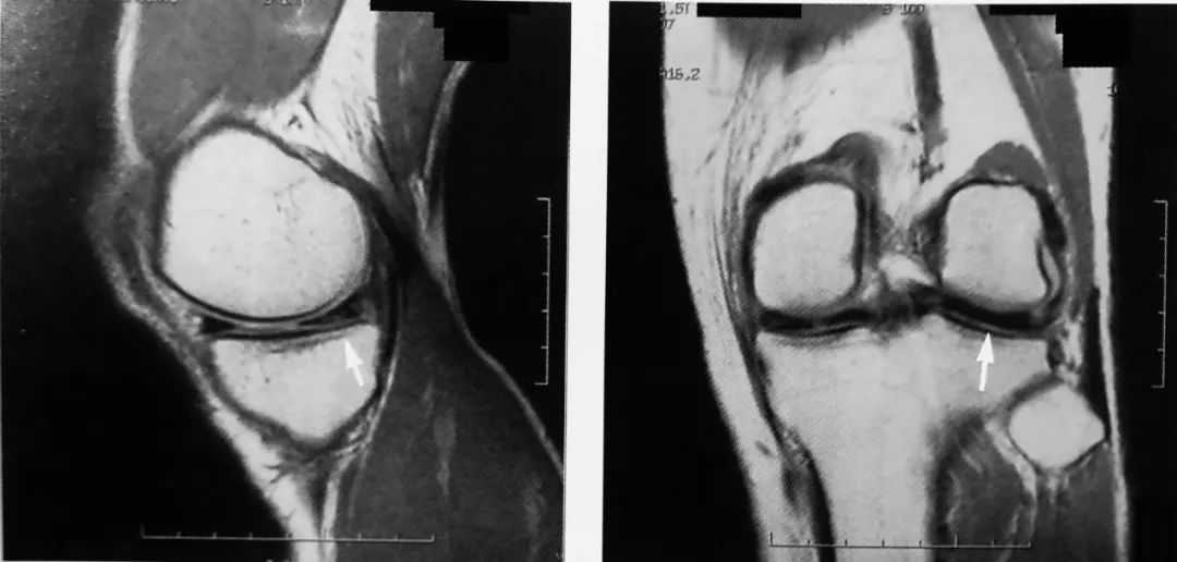 MRI 检查异常和膝前部痛(33岁,男性),该患者以右膝痛为主诉就诊。在其他医院MRI检查发现内侧半月板后节变性断裂(箭头所示),为手术来本院。但是膝痛的部位在前方,半月板断裂引起的摩擦感等机械性损害不明显,认为适合用保守疗法。