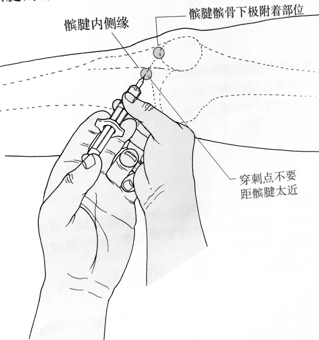 髌腱炎的注射部位:通常在膝关节伸展位标记压痛点(髌腱髌骨下极附着部位与髌腱内侧缘部位,充分触诊,从髌腱内侧缘向内侧旁1-2cm处为穿刺点。这时,向髌骨下极的髌腱内侧进针,在病变的中央部位注射。