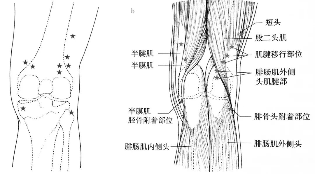 左图:★表示压痛点的好发部位。右图:解剖学的压痛部位。胭窝部位的压痛点绝大多数是在关节腔稍近端的腓肠肌外侧头部位。既往没有外伤的膝痛,很少由于该部位的直接原因导致疼痛。多数存在膝关节的屈曲挛缩、伸展肌力下降、膝前部痛等,不必担心剧烈疼痛。