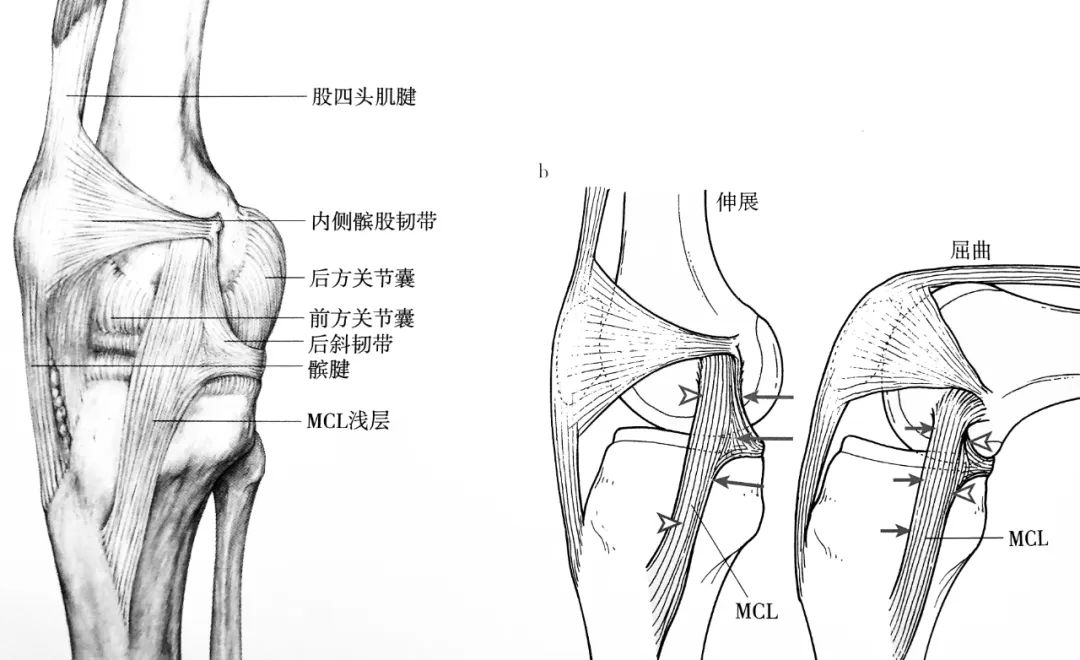 MCL的浅层起自股骨内上髁,附着于胫骨内侧近端广阔的骨膜组织。浅层是与关节囊紧密结合的韧带,其后方移行为后斜韧带,成为宽阔的结构。功能重建时,要充分了解MCL浅层的功能。MCL的深层作为关节囊韧带与关节裂隙内侧的近端和远端相连接。膝关节伸展、屈曲运动时MCL的活动(箭头所示为紧张部位,空箭头所示为松弛部)。浅层在伸展位时,其后方纤维紧张;屈曲位时,其后方部位松弛,前方的纤维紧张。另外,在屈曲时,MCL整体向后方移动。进行MCL功能重建时,应改善整个关节囊的紧张度,有必要恢复MCL浅层的功能,这在技术方面并不容易。