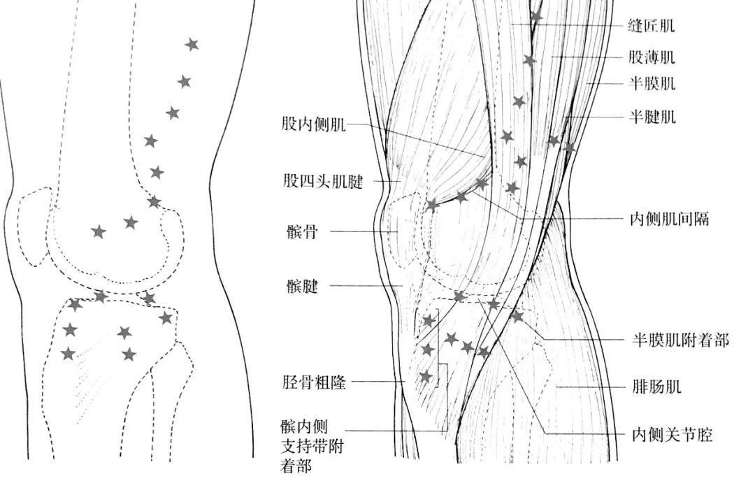 膝关节内侧压痛点:左图:★表示压痛点的好发部位。右图:膝内侧关节腔的压痛点位于纤维性关节囊的胫骨附着部。关节腔的疼痛是半月板损伤的特征。前内侧的疼痛是伸展结构的负荷过重和内侧负荷过重两者共同产生的,解剖上是在髌内侧支持带的胫骨附着部位。事前确认有无软骨的磨损、半月板的损伤,是0形腿还是X形腿,疼痛位于前内侧还是内侧中央等。