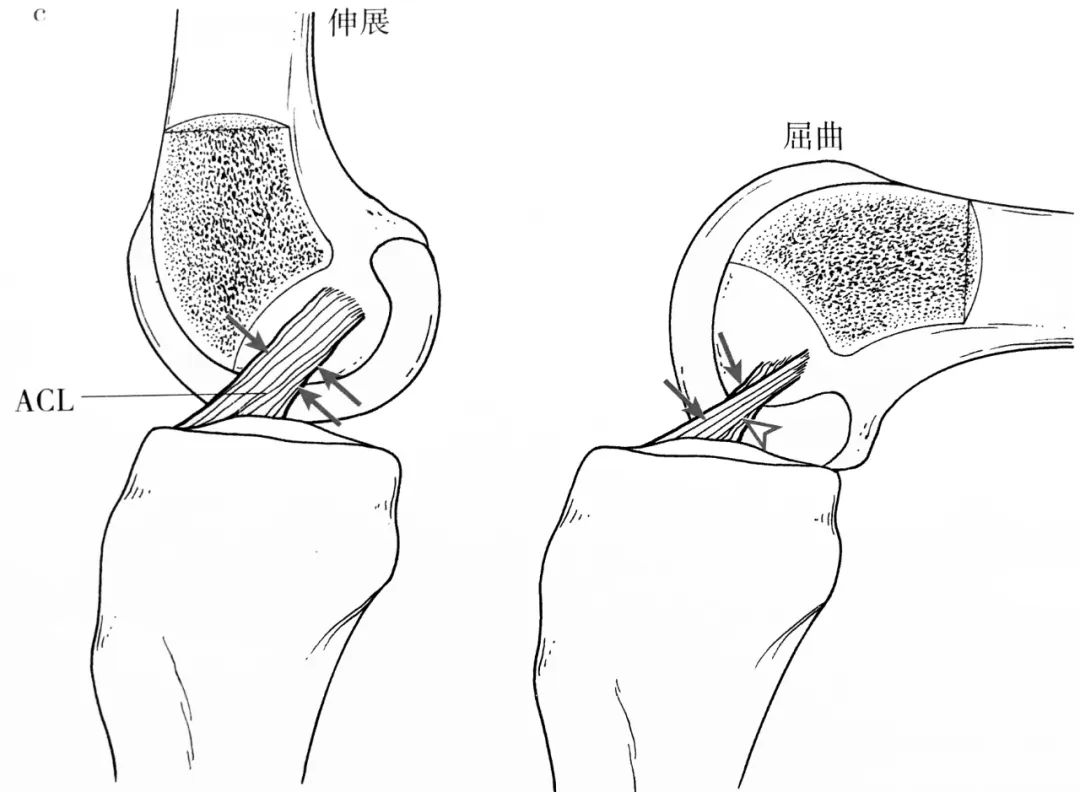 膝关节伸展、屈曲运动时,ACL的运动(箭头所示为紧张部位,空箭头所示为松弛部位)。ACL无论形态还是功能,均能够区分出前内侧与后外侧的纤维束。前内侧束除了最终伸展位外,其屈曲位下显示一定程度的紧张度增加;后外侧束在伸展位时,紧张度增加。前内侧纤维束的功能比较重要。