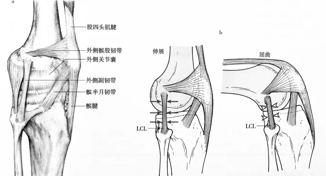 外侧副韧带起自股骨外上髁,附着于腓骨前方外侧。胭肌腱起自股骨外上髁前方远端1cm处,横穿关节囊,贯穿胭肌腱裂孔向胭肌腓骨韧带的腓骨头后方近端延伸并附着。胭肌腱向胫骨远端的后面延伸并广泛附着。外侧髌股韧带起自髌骨中央的外侧和中间阔肌,附着于股骨外上髁的近端,是髌骨外侧支持结构中最强的结构。髌半月韧带与外侧髌股韧带是伸展结构的第二层。膝关节伸展、屈曲运动时LCL的活动(箭头所示为紧张部位,空箭头所示为松弛部位)LCL在膝关节伸展位时最紧张,屈曲时张力随之降低。因此,膝关节屈曲位时,外侧胫股关节的内旋和外旋自由度最大。后外侧复合体的主要结构体是胭肌腱与胭肌腓骨韧带,是屈曲位运动时保持稳定状态的重要制约结构。腓肠肌外侧头与股二头肌是膝关节外侧、后外侧的支持组织,尤其是作为运动的主要成分,弓状复合体等是静止状态韧带的主要成分。