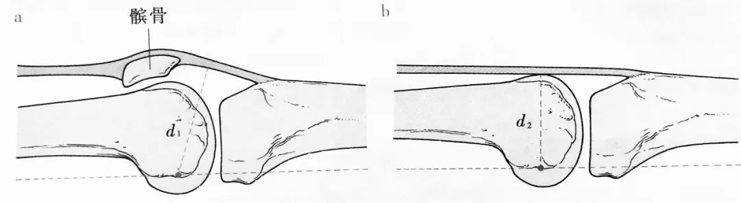髌骨不仅保护膝关节前面,还通过延长膝关节伸展的力臂(d1>d2),提高股四头肌肌力的效率