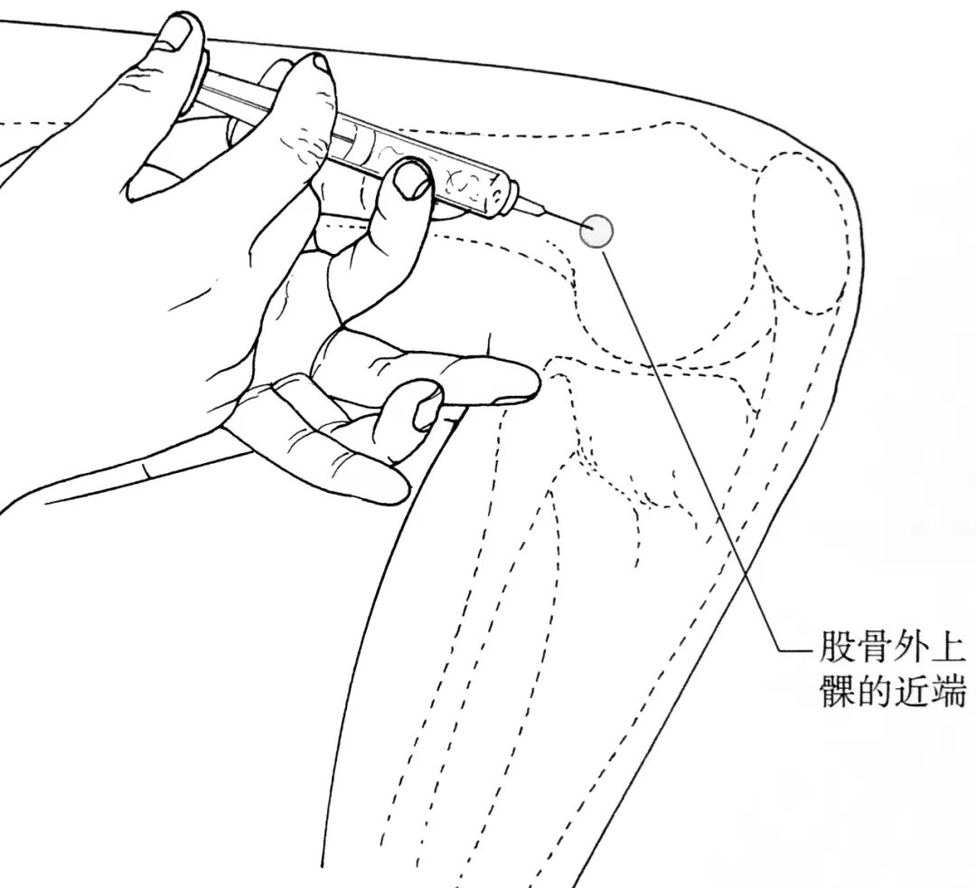 外侧副韧带部位疼痛的注射部位:在盘腿坐位,确认外侧副韧带,朝向外侧副韧带实质部位注射。在最明显压痛点部位注入透明质酸时,保持一定程度的盘腿坐体位,便于穿刺和注射。注意不要注入韧带实质内。