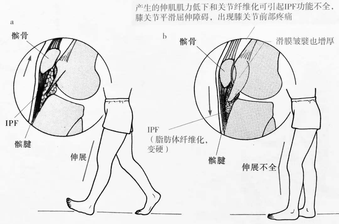 髌下脂肪体(IPF)系膝关节伸展结构的组成部分,IPF自内侧滑膜皱襞开始延续至髌骨上皱襞,髌骨上皱襞与膝关节的肌肉相连接。IPF起缓冲的作用,是保持膝关节伸展运动平滑的结构。人类为了能够正常行走,必须从足跟着地到脚尖离地进行平滑运动,但是出现伸展结构的肌力低下或膝关节屈曲挛缩、膝关节前部疼痛、完全伸展不稳定等,进行足跟着地就困难,负荷就会加在膝关节的后方,导致膝关节屈曲挛缩的恶性循环。
