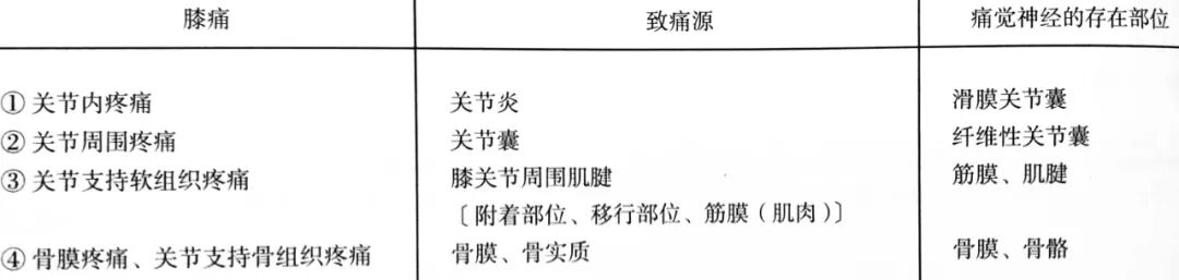 膝痛的致痛源根据部位可分为四类:①滑膜关节囊;②纤维性关节囊与关节囊韧带(关节周围疼痛);③股四头肌等膝关节周围肌肉(关节支持部位疼痛);④肌腱附着部位与关节囊附着部位(骨膜疼痛,关节支持组织疼痛)。
