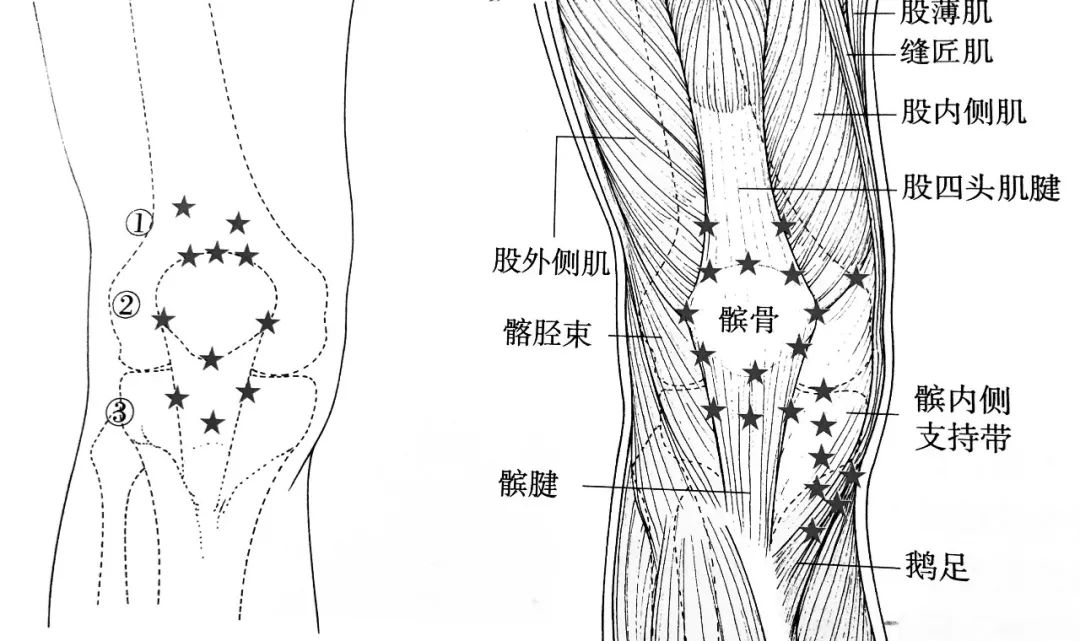 膝关节前部压痛点:左图:★表示压痛点的好发部位。①股肌腱上;②髌骨边缘;③髌腱上。右图:解剖学的压痛部位。显示解剖结构和髌骨周围关联部位的压痛较多。关联部位是容易出现力学缺陷的部位。特别是膝关节的伸展结构容易产生膝痛,占膝痛的一半以上。