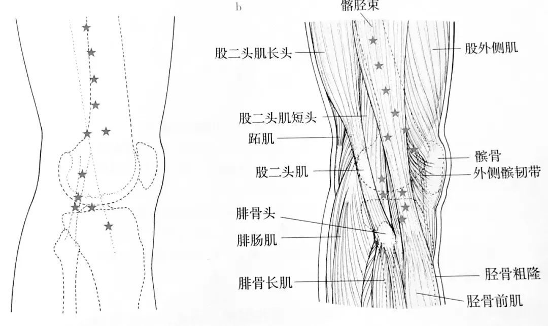 膝关节外侧压痛点:左图:★表示压痛点的好发部位。右图:解剖学的压痛部位,确定膝外侧疼痛不太容易。关节腔的压痛是否由关节内的损伤引起,股外侧肌附着部位、髂胫束外侧副韧带是否有压痛,必须要非常仔细地检查并确认