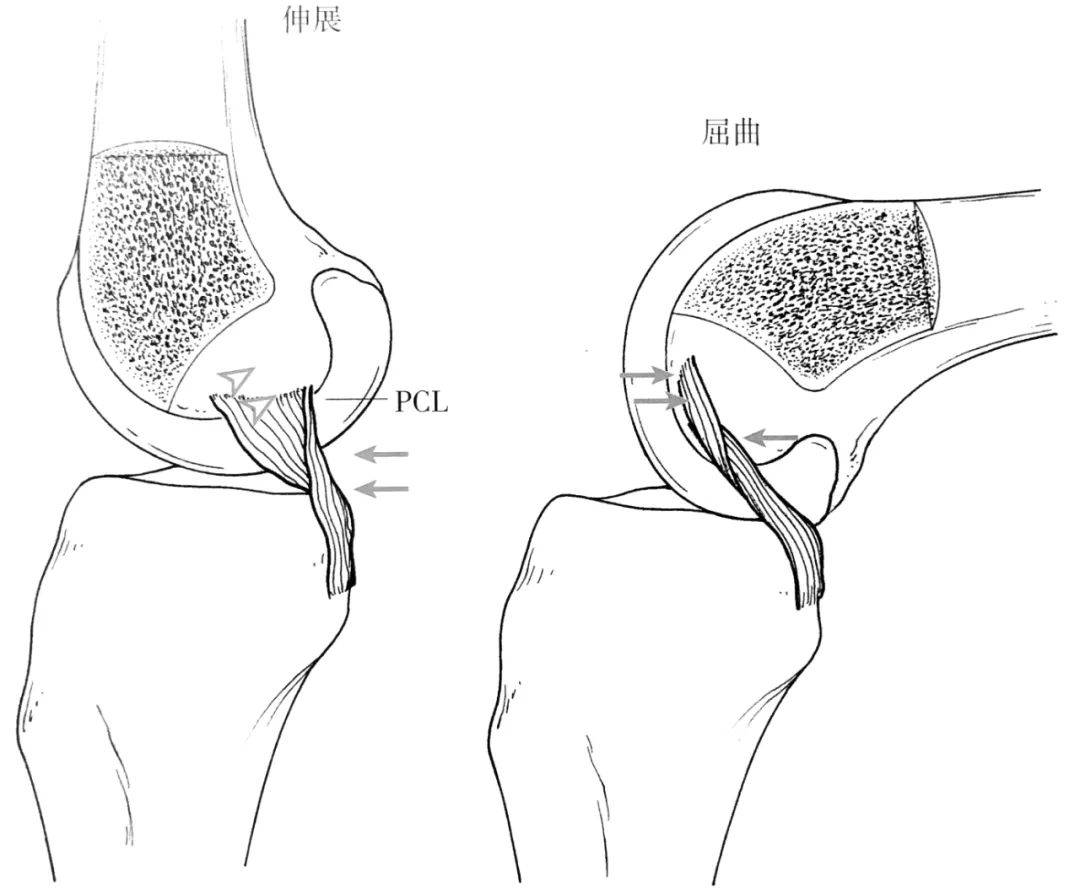 膝关节伸展、屈曲运动时,PCL的运动(箭头所示为紧张部位,空箭头所示为松弛部位)。PCL形态上可分为前外侧与后内侧两个纤维束,功能也分为两个纤维東。前外侧纤维束在膝关节屈曲时,轻度增加紧张度后外侧纤维束在各个方向运动时,均保持正常的紧张状态。但就PCL的功能来说,前外侧纤维束更为重要。这种变化的模式也是平均的。此外,ACL、PCL均是细纤维束的集合体,应用粗的移植肌腱进行移植术重建韧带的功能并不能实现正常的ACL和PCL解剖结构与功能,而且也不充分。ACL与PCL位于狭窄的股骨髁间窝,分别附着在胫骨和股骨,膝关节屈曲和回旋运动会伴有相互的缠绕,有些部分紧张,而有些部分松弛,构成立体的三维结构,以完成相应的功能。