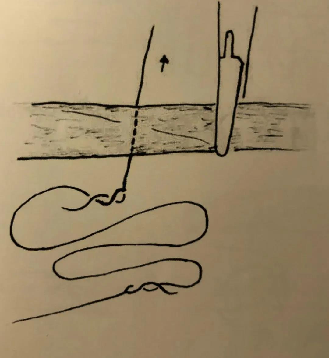 以出针处为中心,与肌腱垂直的方向等距水平进出针,包含的肌腱纤维约为肌腱截面积的1/8-~16。不收紧缝线,使第一针出针处至第二针进针处之间形成一个小环。