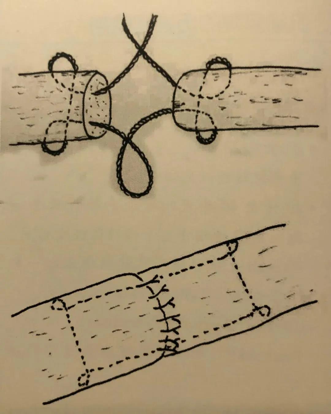 双「十」字缝合:这种缝合方法操作简单,节省时间,但抗张强度较差,仅用于病情需要尽快结束缝合时。缝合步骤:(1)体位和切口:同 Bunnell 埋藏缝合法。