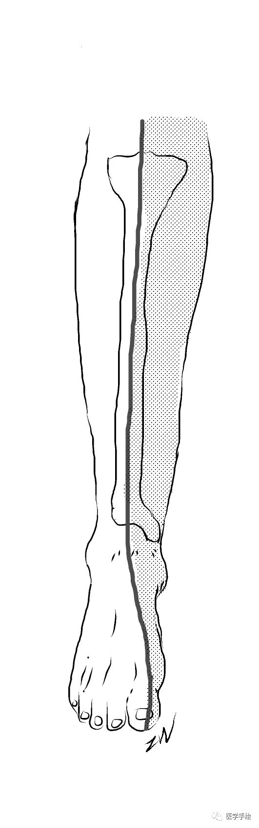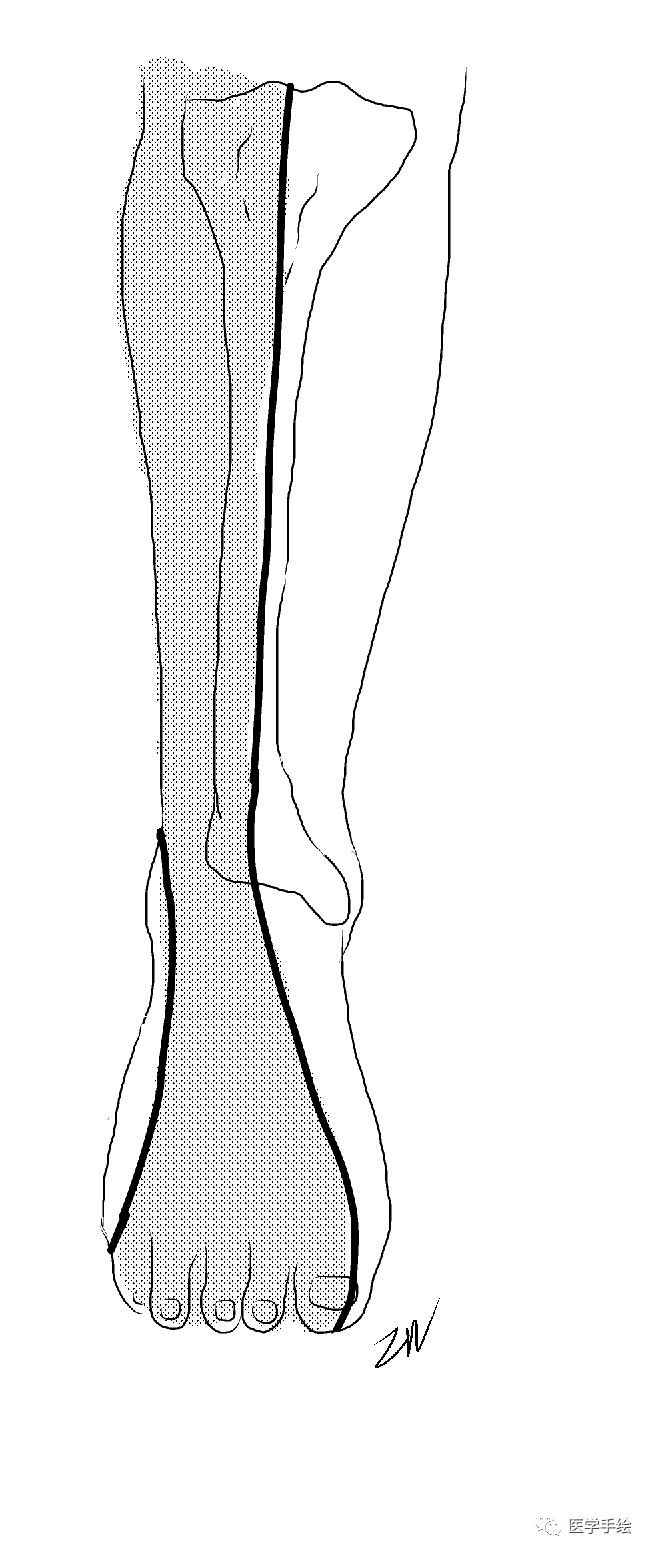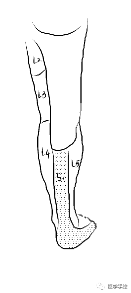 L5感觉支配区域位于小腿外侧及足背侧。胫骨嵴可将L5及L4的支配区域分开来。