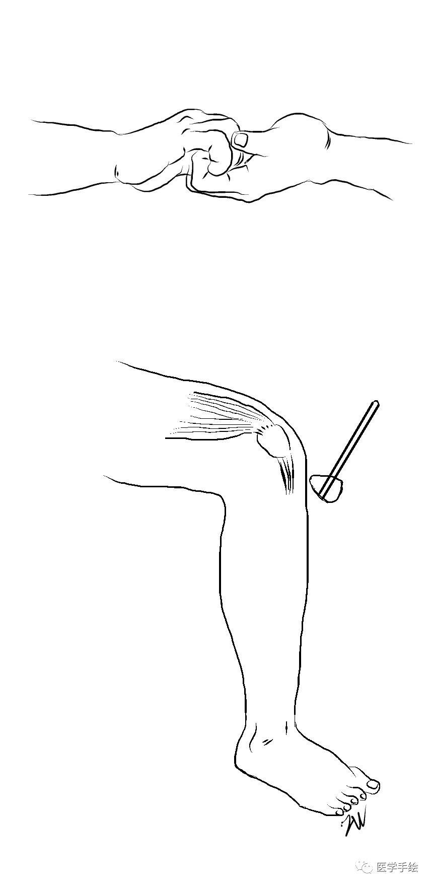 髌腱反射检查:触及髌腱,叩诊锤短暂、轻巧地叩击髌腱。其分级为:正常、亢进、减弱或消失。检查时可让患者双手交叉扣紧以分散其注意力。
