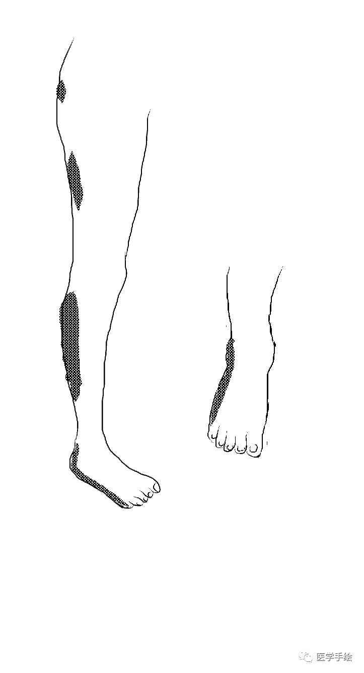 感觉检查:L4的感觉区域位于小腿内侧并延伸至足内侧。膝关节是L3/4的感觉分界线。膝关节以下为L4感觉支配区。胫骨嵴是L4/5的分界线,内侧是L4的支配区。