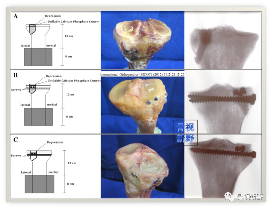 Doht S 等人(2012)模拟老年骨质疏松性胫骨平台压缩骨折模型,将高龄(平均年龄85岁)尸体骨胫骨平台骨折模型分别以单纯人工骨(磷酸钙骨水泥)、人工骨+栅栏螺钉、单纯栅栏螺钉固定分组进行生物力学比较发现:只有将“栅栏螺钉”与人工骨植骨结合应用,才可避免平台关节面的复位丢失(如下图)。