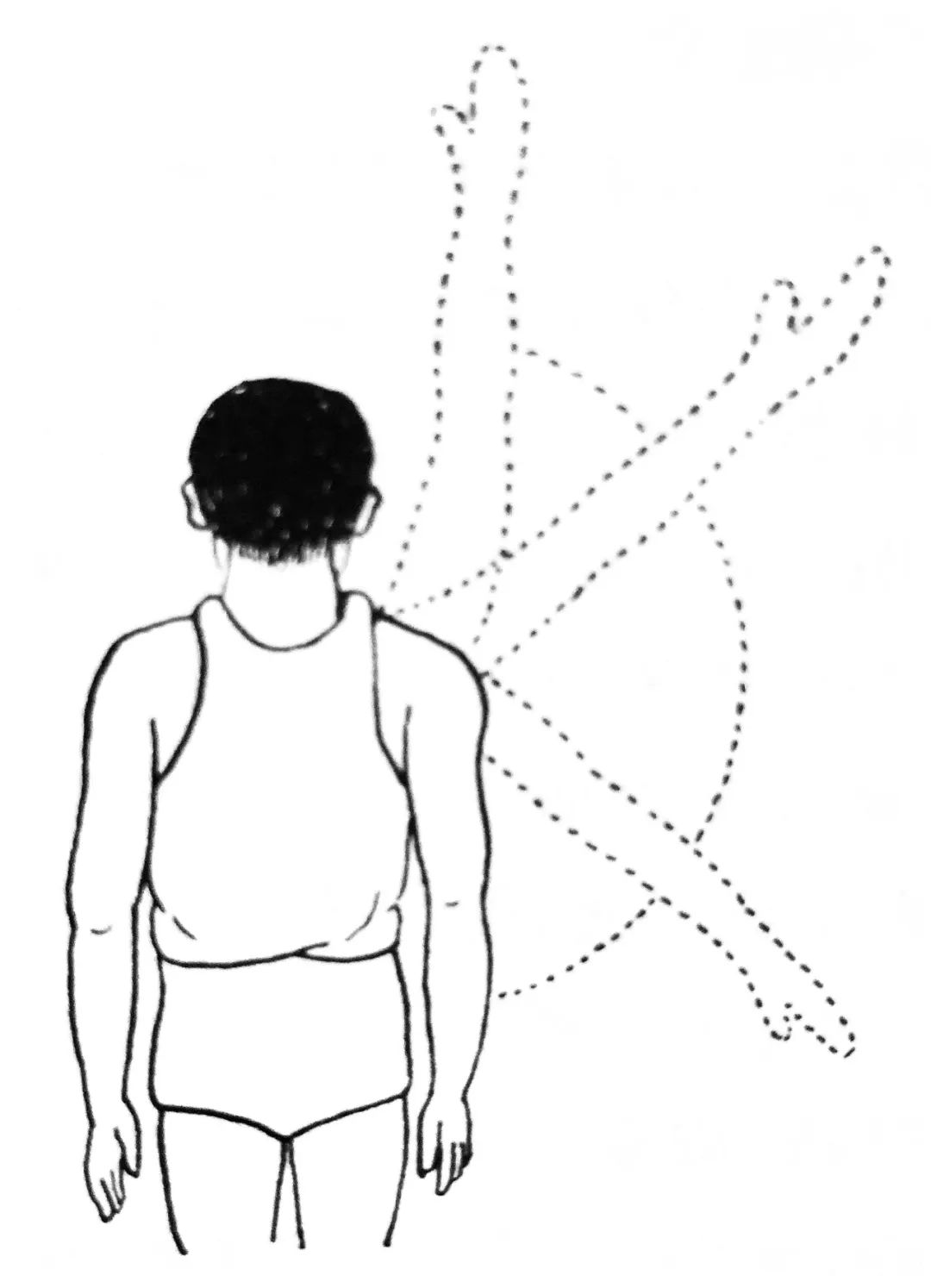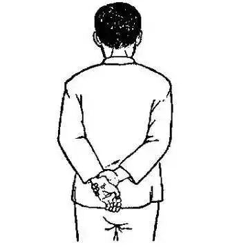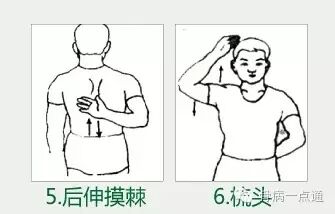 5、后伸摸棘—— 患者自然站立,在患侧上肢内旋并向后伸的姿势下,屈肘、屈腕,中指指腹触摸脊柱棘突,由下逐渐向上至最大限度后呆住不动,2分钟后再缓缓向下回原处,反复进行,逐渐增加高度。也可做越头摸耳的动作。