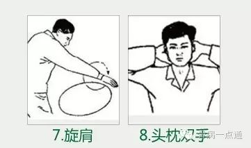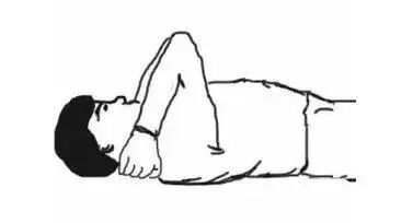 8、枕手展肘——头枕双手 患者仰卧位,两手十指交叉,掌心向上,放在头后部(枕部),先使两肘尽量内收,然后再尽量外展。