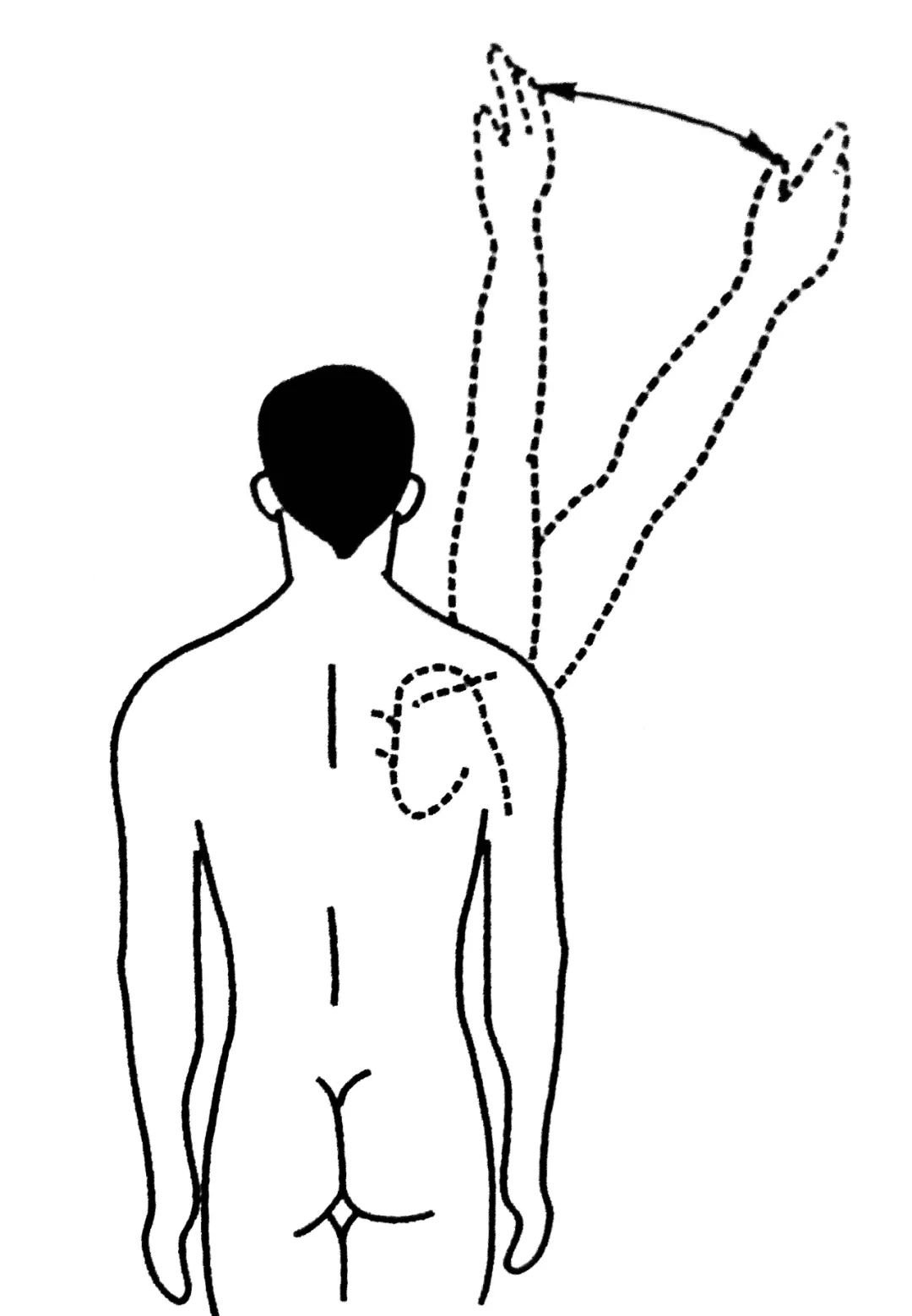 患者患肢后伸,手指尖向对侧肩胛骨触摸,正常时能触及肩胛骨下角以上,肱二头肌长头腱鞘炎时,此活动受限,肩周炎患者也受限。