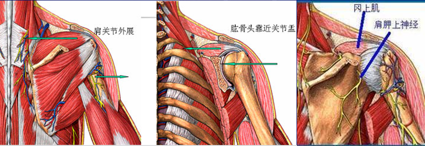 寻找肩部压痛点,可发现在肩前方的喙突外侧肱骨结节间沟、肩峰下及肩峰后,可见肩胛肌,冈上、下肌及三角肌萎缩。