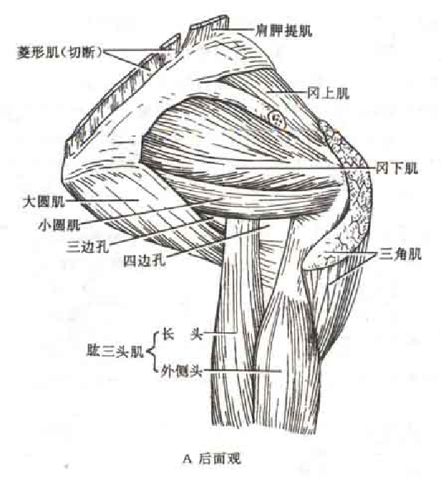 可分两层。外层为三角肌,内层为冈上肌、冈下肌、肩胛下肌和小圆肌四个短肌及其联合肌腱。联合肌腱和关节囊紧密相连,附着于肱骨上端如袖套状,称为肩袖或旋转肩袖。肩袖是肩关节活动时受力最大的结构之一,易于损伤。