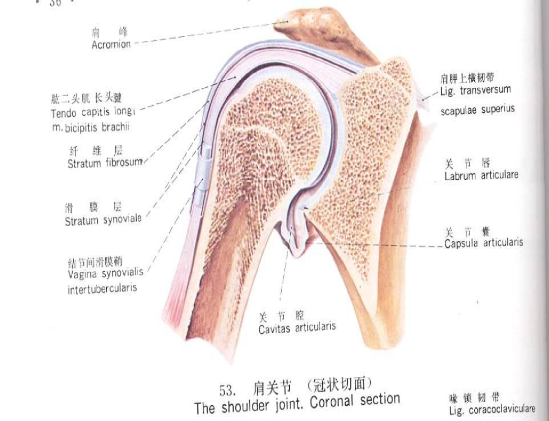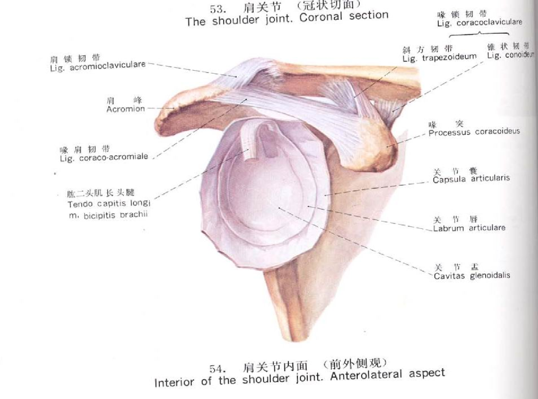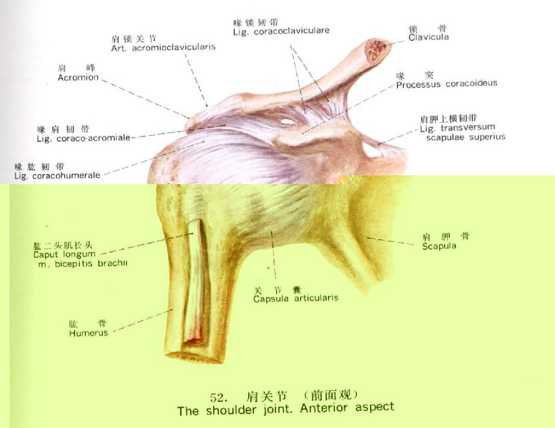 喙肩韧带连结于喙突与肩峰之间,形成喙肩弓架于肩关节上方,可防止肱骨头向内上方脱位。