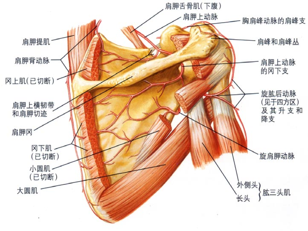 肩胛下肌扁且广阔,邻近前锯肌,起自肩胛下窝,肌束向外上,经肩关节的前方,止于肱骨小结节。作用是使肩胛关节内收和旋内。