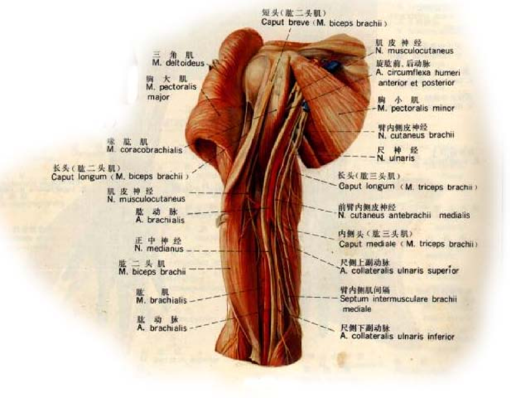 肱二头肌长头腱起于关节盂上方,经肱骨结节间沟的骨纤维隧道,此段是炎症好发之处。肱二头肌短头起于喙突,经肱盂关节内前方到上臂,受炎症影响后肌肉痉挛,影响肩外展、后伸。