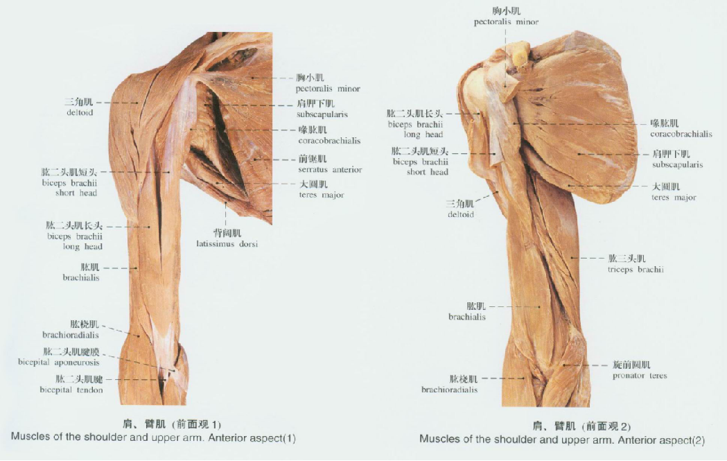 肱二头肌长头起于肩胛骨盂上结节,短头起于肩胛骨喙突