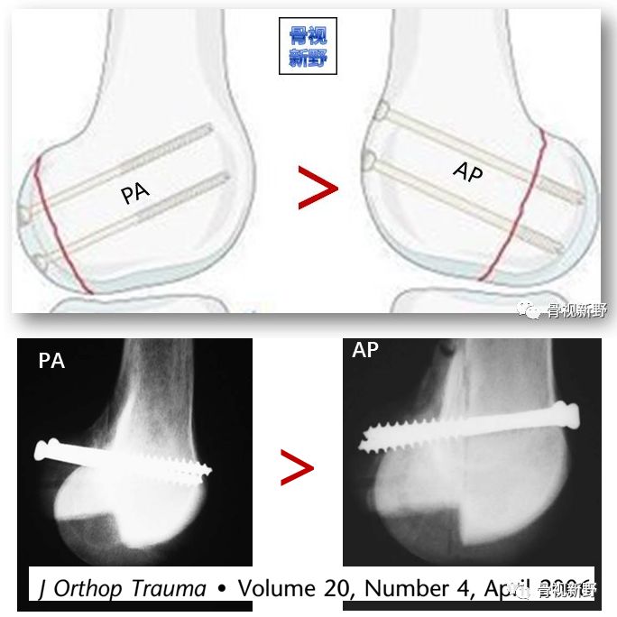 但研究发现,从后向前(PA)植入拉力螺钉对骨折固定的强度和稳定性显著高于由前向后(AP)置入的螺钉[Soni A 2012;Jarit GT 2006]。