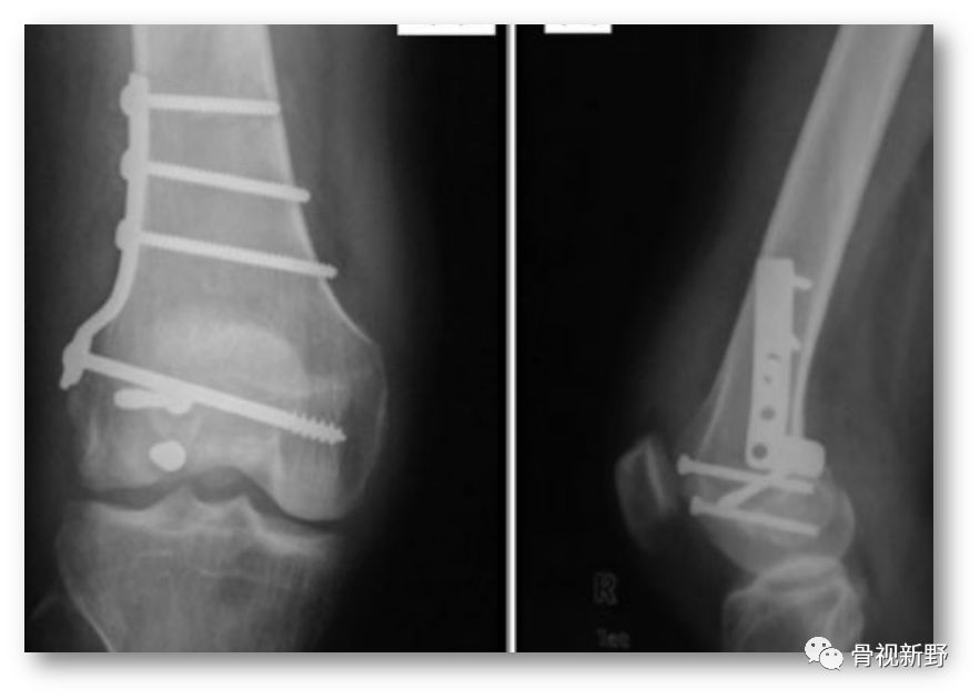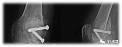 但对骨质疏松患者及后髁粉碎骨折的病例,单纯使用拉力螺钉不但不能达到坚强固定,还会导致进一步的骨质压缩;螺钉的把持力也较弱,易致固定失败,因此有必要加用支撑钢板进行固定。